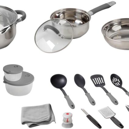 Küchenset mit Basisausstattung für die mobile Küche. Technische Daten: Farbe: lime,schwarz Material: Edelstahl Nettogewicht: 4,25 kg Packmaß: 45 x 33,5 x 19,5 cm Lieferumfang: Edelstahl-Topf mit Silikongriffen ø 22 cm – 3,5 Liter Deckel ø 22 cm aus Glas mit Silikongriff Edelstahl-Kasserole ø 17 cm – 1,3 Liter mit Silikongriff Deckel ø 17 cm aus Glas mit Silikongriff Kunststoffbehälter mit Deckel ø 16 cm Kunststoffbehälter mit Deckel ø 13 cm Kunststoffbehälter mit Deckel ø 11 cm Edelstahlpfanne ø 23 cm -…