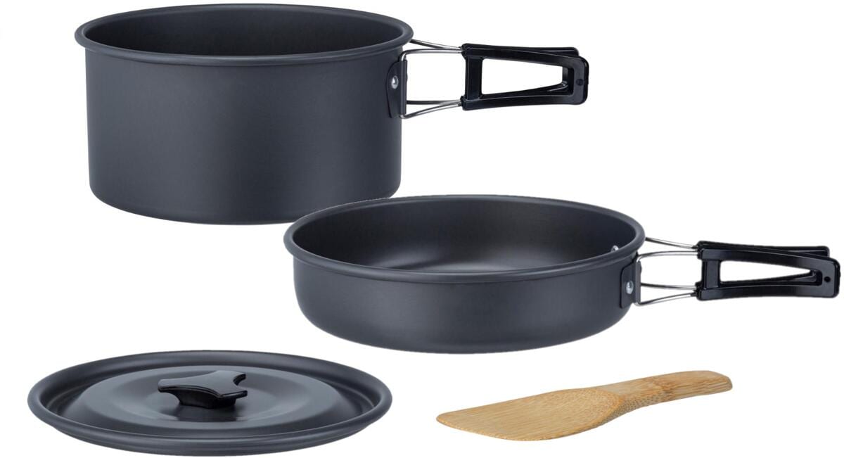 Outdoor-Kochset aus eloxiertem Aluminium für 3/4 Personen. Klappbare Griffe mit wärmeisolierendem Silikon beschichtet. aus eloxiertem Aluminium klappbare Griffe für alle Herdarten geeignet (außer Induktion) Technische Daten: Gewicht: 910 g Material: Aluminium Farbe: schwarz Lieferumfang: 1 Topf mit Deckel Ø 19 x 11,2 cm 1 kleiner Topf mit Deckel Ø 16,6 x 8,9 cm 1 Pfanne Ø 19,5 x 4,5 cm 1 Bambuslöffel 1 Kocher Ständer Tragetasche