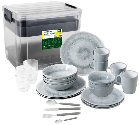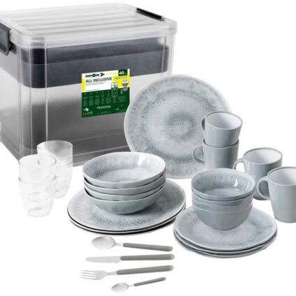Mit dieser Geschirrserie sind Sie für jede Mahlzeit ausgestattet. Das All Inclusive-Geschirrset mit 40 Teilen und Transportbox bietet alles was man für 4 Personen benötigt. Das neu entwickelte Stone Touch Geschirr aus einem Melamin-Mineralgemisch mit hervorragenden funktionellen Eigenschaften. Die Becher sind aus Resylin, ein farbloser Thermoplast auf ABS-Basis (Acrylnitrilbutadienstyrol), bei dem sich gute mechanische Eigenschaften mit einer guten Chemikalienbeständigkeit verbinden. 100% BPA-frei und…