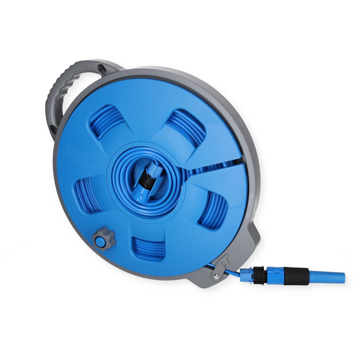 Schlauchkassette mit flexiblem, verwindungsfestem und lebensmittelechtem Flachschlauch (3-Kammersystem), der bei Gebrauch nur bis zur benötigten Länge ausgerollt werden muss. Schnellkupplungen und Spritzdüse sind im Lieferumfang enthalten. Technische Daten: Schlauchlänge: 15 m Maße (⌀ x H): 40 × 48 cm Gewicht: 2,33 kg