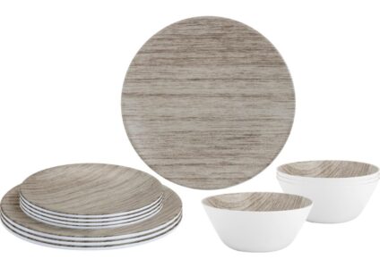 Mit dieser Geschirrserie in angesagter Holzoptik sind Sie für jede Mahlzeit ausgestattet. lebensmittelecht geschmacks- und geruchtsneutral tiefkühlgeeignet spülmaschinenfest bruchfest & langlebig Technische Daten: Material: Melamin Lieferumfang: 4 Schalen (Ø 15 cm) 4 Essteller (Ø 26 cm) 4 Dessertteller (Ø 20 cm)