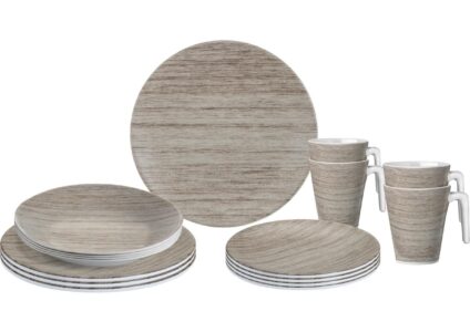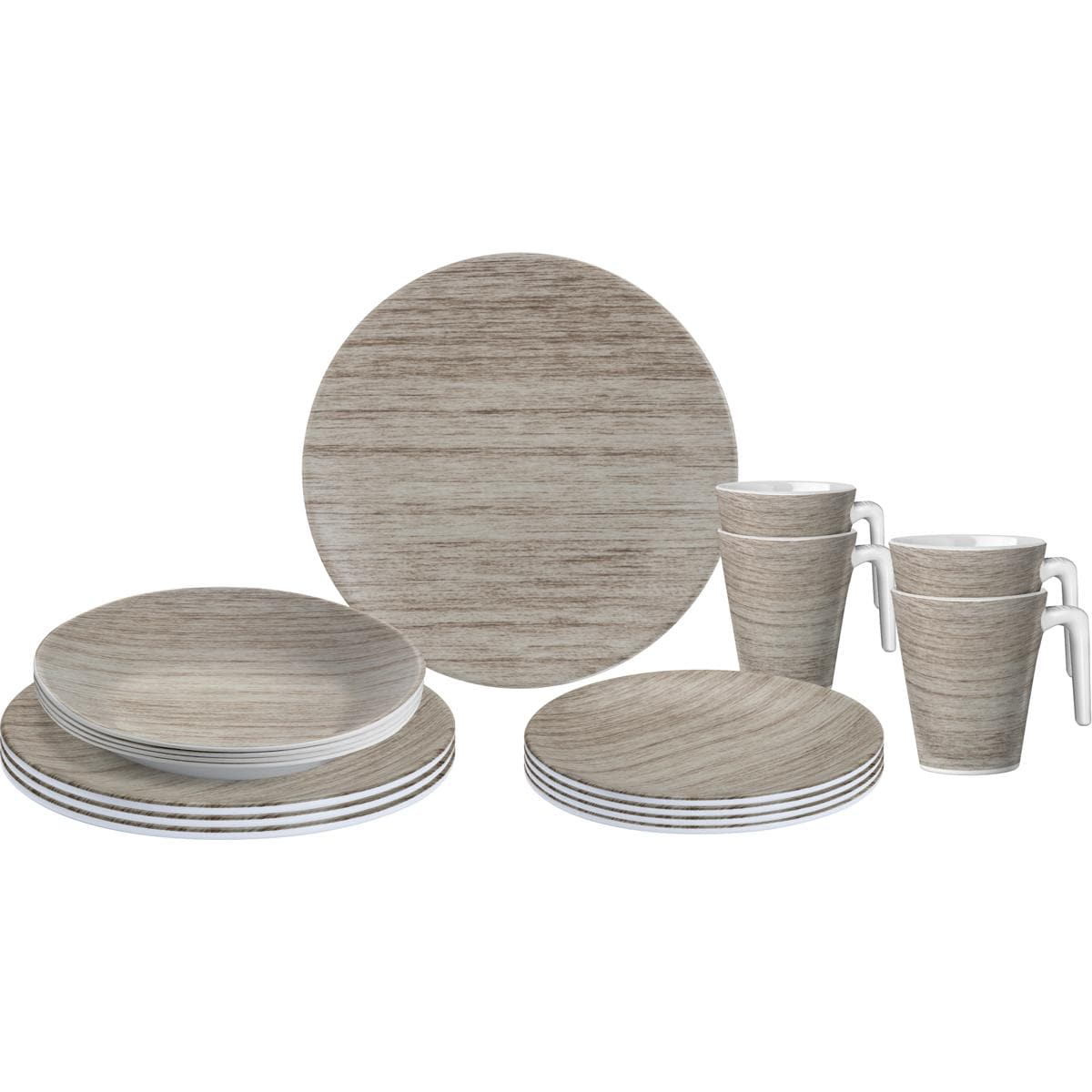Mit dieser Geschirrserie in angesagter Holzoptik sind Sie für jede Mahlzeit ausgestattet. lebensmittelecht geschmacks- und geruchtsneutral tiefkühlgeeignet spülmaschinenfest bruchfest & langlebig Technische Daten: Material: Melamin Lieferumfang: 4 Suppenteller (Ø 21 cm) 4 Essteller (Ø 26 cm) 4 Dessertteller (Ø 20 cm) 4 Henkelbecher (30 cl)