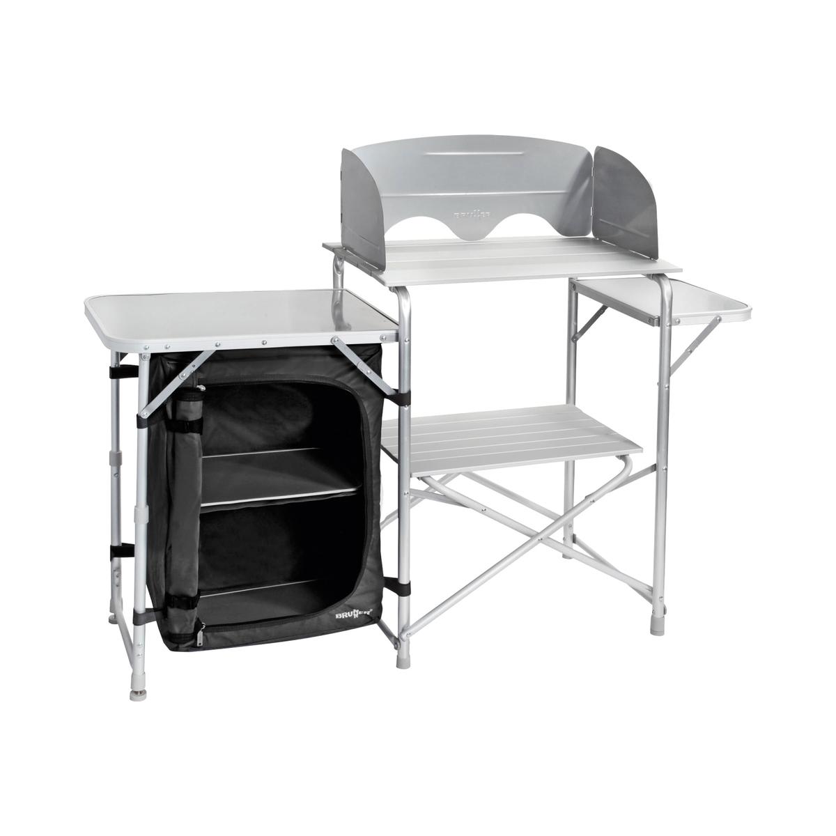 Praktische Kombination aus Feldküche und Geschirrschrank. Stabiles Gestell aus Alu-Hybrid ø 19 mm und großer MDF-Arbeitsplatte mit umlaufendem Aluminium- Rahmen. Der Schrank verfügt über zwei Innenablagen und eine RV-Tür. einfacher und schneller Aufbau. inklusive Aufbewahrungstasche (100 % Polyester) Technische Daten: Material Bezug: 100 % Polyester Material Gestell: Aluminium Abmessungen (BxTxH): 143 x 40 x 80 cm Packmaß: 51 x 80 x 11 cm Gewicht: 6,5 kg
