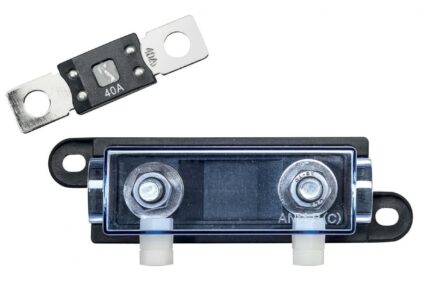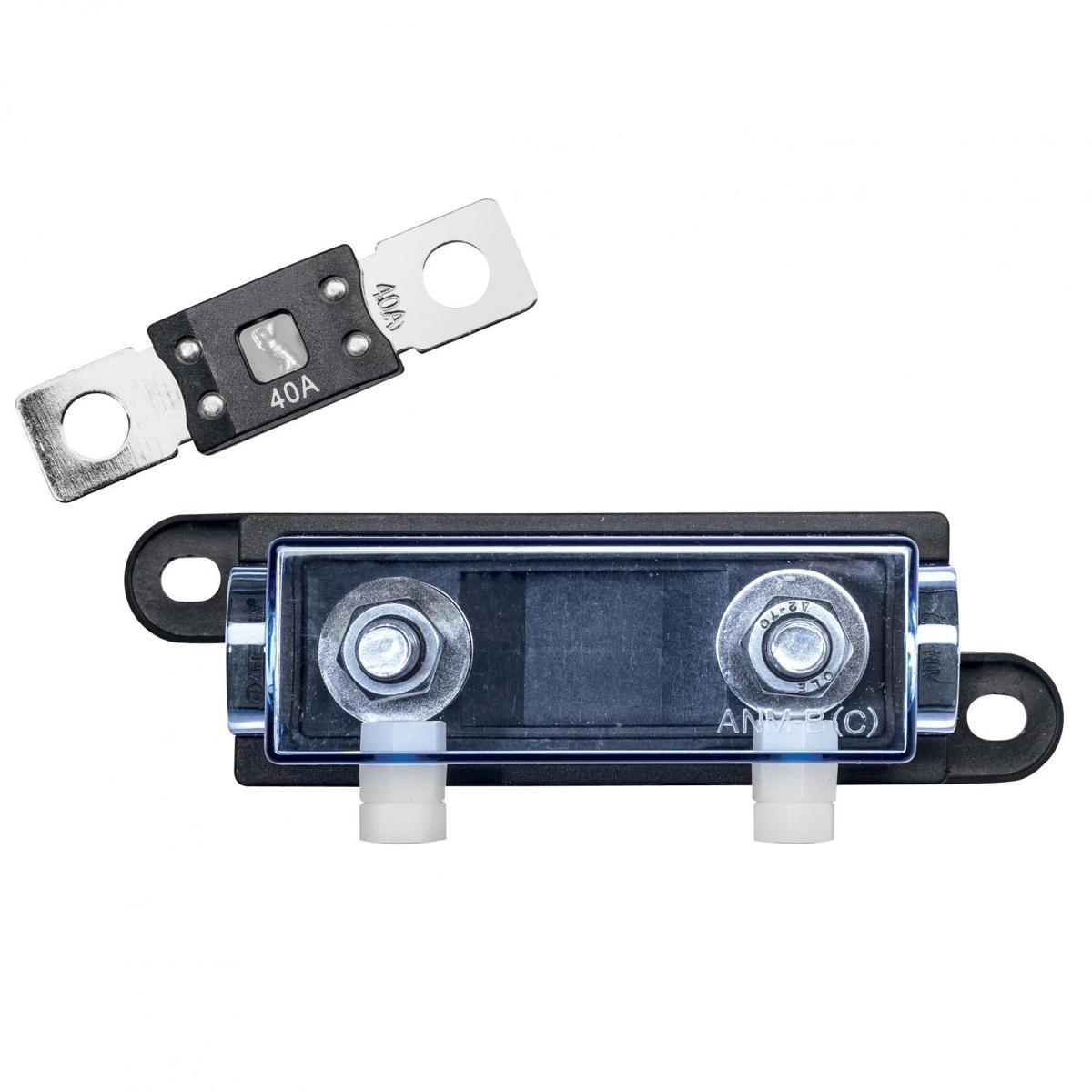 Hochlast-Sicherungshalter für eine bzw. zwei Streifensicherungen. Beidseitig M8, Lieferung ohne Sicherung (-en). Technische Details: Typ: HD-1 Ausführung: 1-fach Maße (L x B x H): 126 × 37 × 44 mm Gewicht: 112 g
