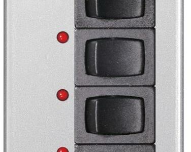 Vier Schalter mit LED-Kontrolle für getrennte Stromkreise. Bei Schalterbetrieb leuchtet die jeweilige LED Technische Daten: Spannung: 12 V Belastbarkeit: 8 A Abmessungen (B x T x H): 8,5 × 2,5 × 4,7 cm Gewicht: 90 g