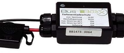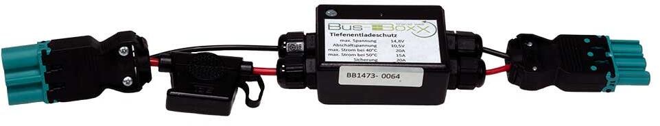 powerBOXX TiefentladeschutzDer Tiefentladungsschutz ist als Zwischenstecker ausgeführt. Er wird zwischen dem Batterieanschlusskabel und der powerBOXX geschaltet. Das besondere Merkmal dieser Komponente ist, dass die Batterie vor der schädlichen Tiefentladung geschützt wird und sie trotzdem noch im abgeschalteten Zustand mit der fi-Boxx geladen werden kann. Der Tiefentladungsschutz hat eine Blink-LED zur Anzeige des Batterie-Status. Eine zusätzliche KFZ-Sicherung sichert den Tiefentladungsschutz.