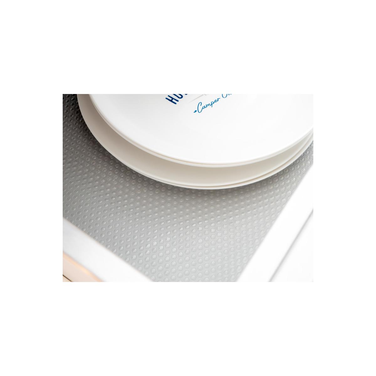 Die transparente Antirutschmatte ist vielseitig einsetzbar z.B. für Schränke, Schubladen, Kühlschränke. Die beidseitig strukturierte Matte ist aus EVA (400g/m²) und hat eine geräuschdämmende Wirkung z.B. während der Fahrt im Wohnmobil. individuell zuschneidbar wiederverwendbar abwaschbar wasserbeständig reißfest Technische Daten: Größe: 150 x 45 cm Farbe: transparent