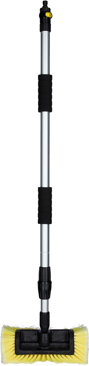 Diese Teleskop-Waschbürste hat seitliche Borsten und reinigt damit Ecken noch leichter. Die Bürstenbreite liegt bei ca. 26cm. Der Aluminiumstab ist stufenlos verstellbar von 120-180 cm. Die Bürste hat einen Anschluss für Wasserschlauch (Gardena-Wasseranschluss-Ventil), Sperrventil und Isolationsgriffe aus schwarzem Schaumstoff. Seitliche Borsten Technische Daten: Teleskopstiel: 1,2 – 1,8 m Bürstengröße: ca. 26 x 14 cm Lieferumfang: Waschbürste, Teleskopstiel