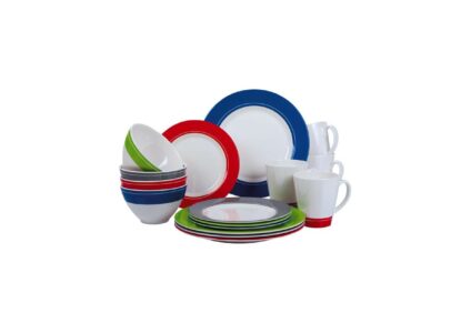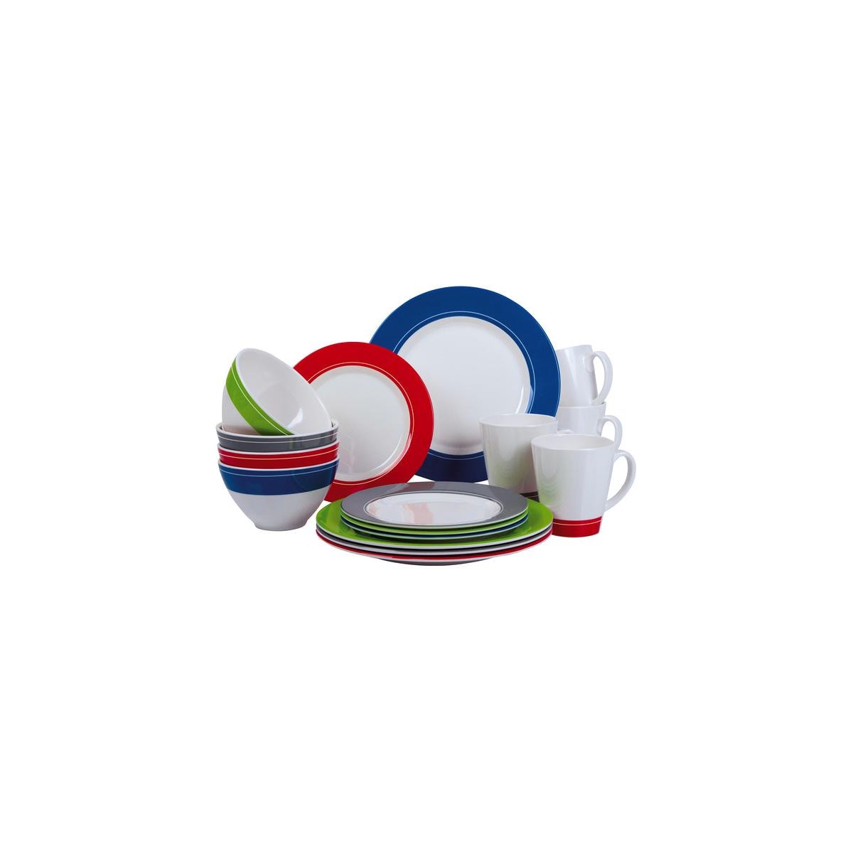 Erleben Sie mit dem Geschirrset frohe Farbenvielfalt auf dem Essenstisch. 16-teiliges lebensmittelechtes Geschirrset für 4 Personen aus 100% Melamin. spülmaschinengeeignet nicht geeignet für Mikrowelle. komplettes mehrfarbiges Gedeck Technische Daten: Gewicht: ca. 2,3 kg Material: Melamin Farbe: mehrfarbig Lieferumfang: 4 Essteller (Ø 25 cm) 4 Desserteller (Ø 20 cm) 4 Schüsseln (Ø 6/14 cm H8 cm, 550 ml) 4 Henkelbecher (Ø 6/9 cm H10 cm, 400 ml)