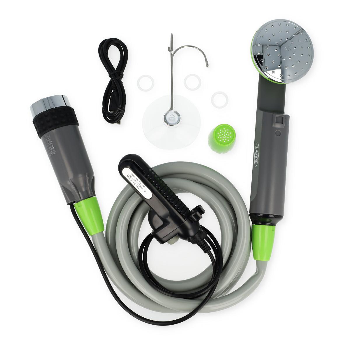 Die schlanke Akku-Pumpe passt durch viele Kanisteröffnungen. Sie wird an einem separatem Schalter, der sich am externen Akku befindet, ein- und ausgeschaltet. Der Akku hält für ca. 45-60 Minuten Duschvergnügen und kann per USB-Kabel geladen werden. Dank des 180 cm langen Duschschlauch ist die Dusche auch für große Personen geeignet. Mit langem Duschschlauch, auch für große Personen Akku hält bis zu 60 Minuten Technische Daten Förderleistung: 2,2 l/min Ladezeit: ca. 2-5 h Akku: 2200 mA Schlauchlänge: 180…