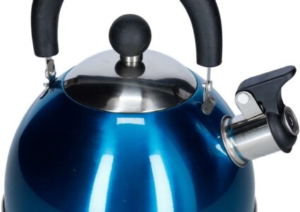 Hochwertiger Flötenkessel aus Edelstahl, mit Pfeife und Sandwichboden. Mit isoliertem Griff, platzsparend umlegbar. mit Pfeife u.Sandwichboden Einhandbedienung Griff isoliert und platzsparend umlegbar Technische Daten: Volumen: 1,8 Liter Gewicht: 0,42 kg Maße: ø 18 cm, Höhe 23 cm Material: Edelstahl Farbe: blau