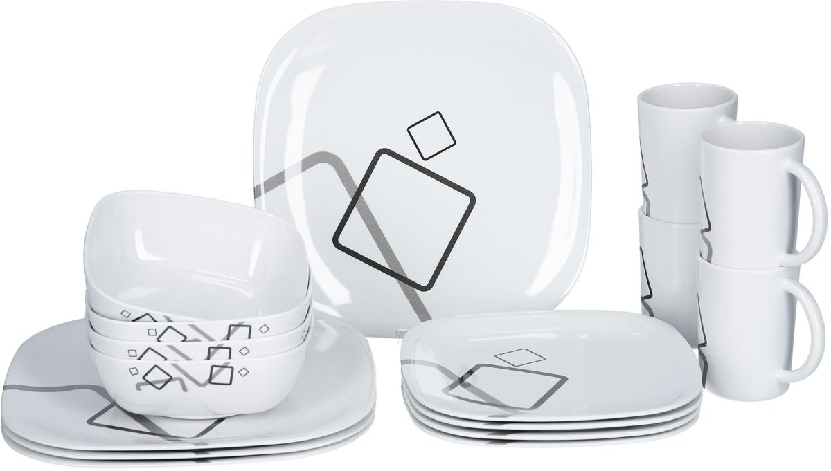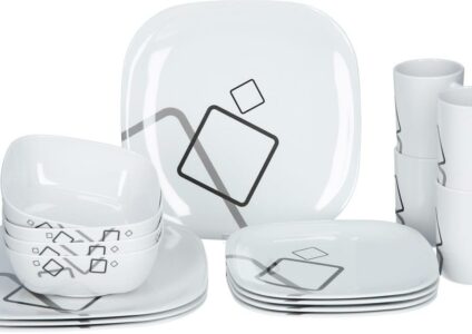 Das 16-teilige Melamin-Geschirrset für 4 Personen ist mit einem Antirutschring ausgestattet und somit ideal für Urlaub im Camper, Wohnwagen, Wohnmobil und v.a. auch auf Booten. Durch die quadratische Form kann der Platz im Schrank optimal genutzt werden. große Tellernutzfläche lebensmittelecht mit Anti-Rutsch-Ring für sicheren Stand bei niedriger Temperatur spülmaschinengeeignet nicht geeignet für Mikrowelle Technische Daten: Gewicht: 3,0 kg Material: Melamin Lieferumfang: 4 Essteller (Ø 26,5 cm) 4…