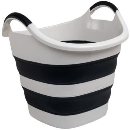 Faltbare Wanne / Korb mit 22 Litern Volumen zur flexiblen Nutzung. große Tragegriffe mit Griffschutz großes Volumen kleines Packmaß Technische Daten: Maße: L 425 x B395 x H385 mm Material: PP/TPR Farbe: grau, weiß Packmass: L42,5 x B39,5 x H17 cm Volumen: 21 Liter