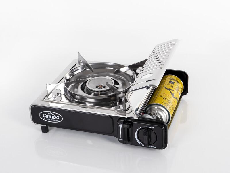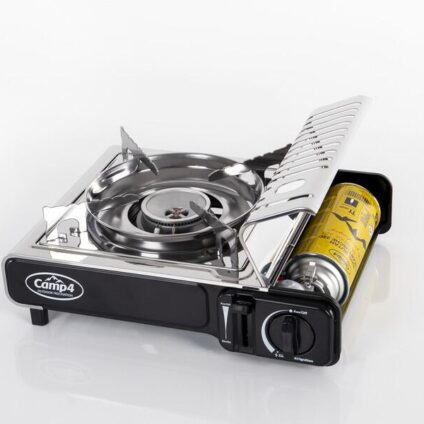 Der Camp4 Gourmet Kartuschenkocher zeichnet sich durch seine hohe Leistunge und dem kleinen Packmaß aus. Es wird durch eine Bajonettkartusche betrieben. Die Flamme ist stufenlos verstellbar. Es verfügt über eine Zündsicherung und einer Piezo-Zündung. Der hochwertige Gourmet-Kocher hat eine Edelstahl-Oberfläche, und kommt in einem praktischen und handlichen Kunststoff-Tragekoffer, das ganze bei nur ca. 1,8 kg Gewicht. Technische Daten: Anzahl Brenner: 1 Leistung: 2.2 kW Verbrauch Gas g/h: 160 g/h…
