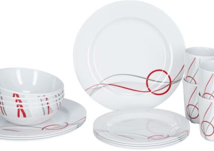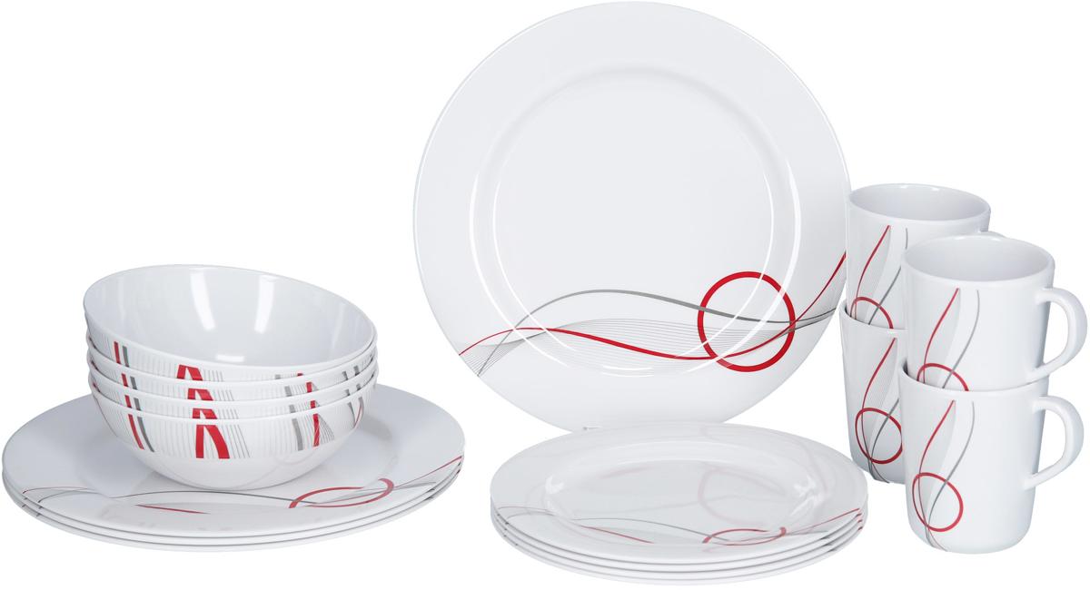 Melamin Geschirr-Set Imola, 16-teilig für 4 Personen. Das Geschirrset besteht aus 100% Melamin und ist lebensmittelecht. Bei niedriger Temperatur spülmaschinengeeignet. flach zu verstauen lebensmittelecht Spülmaschinengeeignet im oberen Geschirrkorb bei niedriger Temperatur HInweis: Nicht Mikrowellengeeignet Technische Daten: Gewicht: 1,9 kg Material: Melamin Lieferumfang: 4 Essteller (Ø 25,3 cm) 4 Suppenschalen (Ø 15,2 cm) 4 Dessertteller(Ø 20 cm) 4 Henkelbecher (0,3 L)