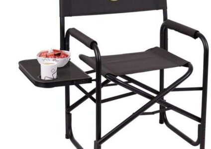 Regiestuhl Maxi mit schwarzem Aluminiumgestell und praktischem Seitentisch. Platzsparend verstaubar Belastbar bis 100kg Technische Daten: Packmaß: 85 x 50 x 17 cm Gewicht: 3,4 kg Produktmaß: 46 x 38 x 87 cm