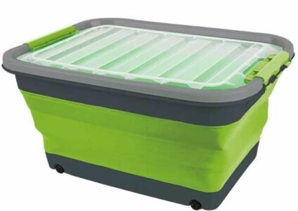 Die Boxen sind faltbar mit Fixierungsbügeln und Deckeln zum Einrasten. 4 Rollen Technische Daten: Material: TPR/PP Farbe: grau, lime Produktmaß: L 54,5 x B 40 x H 9,6/27,5 cm Volumen: 30 Liter
