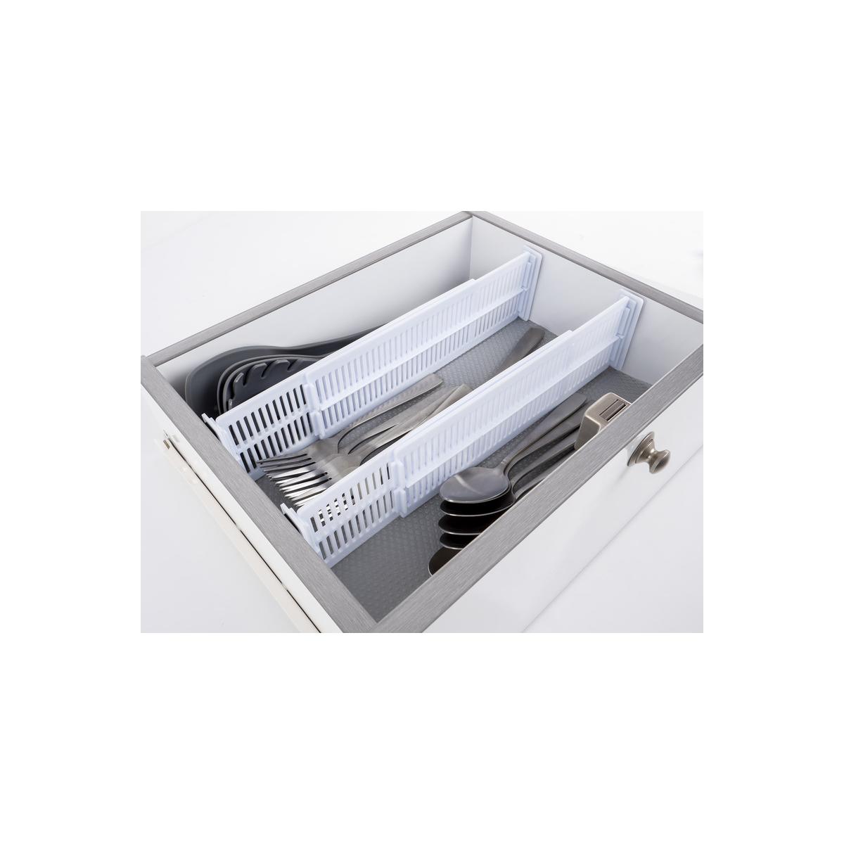 Variable Teilung der Schubladen für flexible Nutzung! 2er Set, bestehend aus 4 Trennwänden, für die Schublade. Jeweils 2 Trennwände werden variabel miteinander durch einklicken verbunden (von 27,5-51cm) und dann per Klebeetikett in die Schublade eingesetzt. Technische Daten: Material: Kunststoff Maße (je Trennwand): L 27,5 x H 8 cm Farbe: weiß, transparent Gewicht: ca. 0,2 kg Lieferumfang: 4 Trennwände 4 Enden mit Klebefixierung