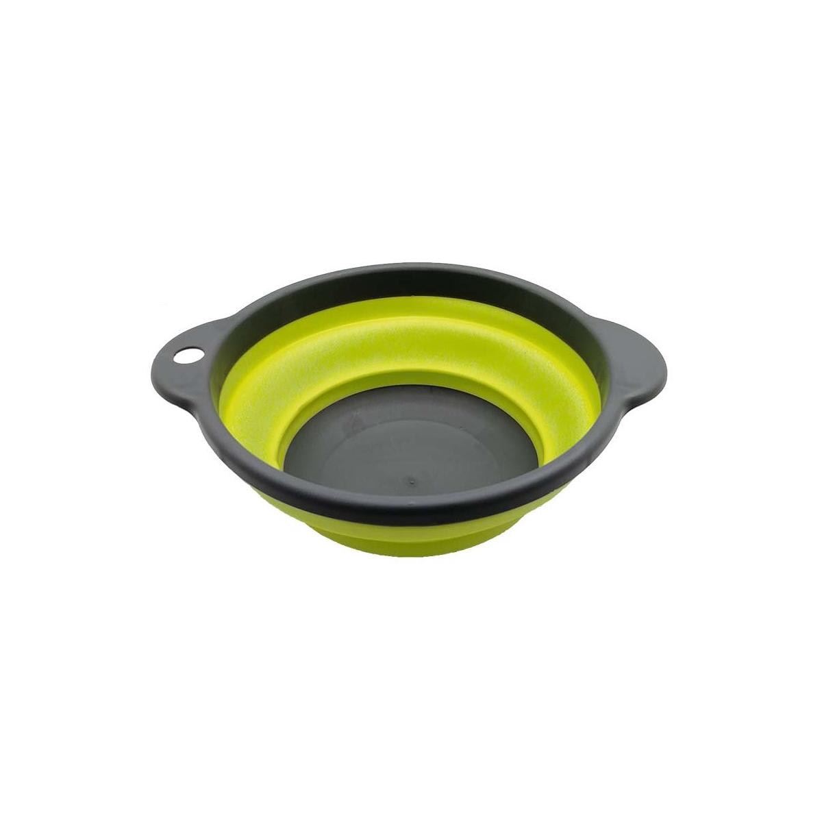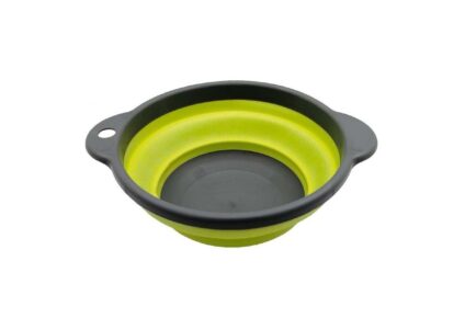 Faltbare Schüssel mit 2 Griffen und praktischem Loch zum Aufhängen Material: TPR Farbe grau/lime Durchmesser: Ø 20 cm Höhe: 3,5 cm / 9 cm Volumen: ca. 500 ml