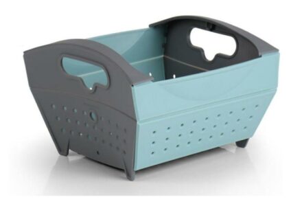 Robustes, faltbares Sieb, multifunktional z.B. für Salat, Obst, Gemüse waschen. Auch als Obst- und Aufbewahrungskorb verwendbar. hochwertig gefertigt mit Feststellknopf zum Schließen robust und langlebig Technische Daten: Maße geöffnet: 24 x 23 x 15 cm Maße gefaltet: 32 x 30 x 2,5 cm Gewicht: 300 g Farbe: aqua/grau