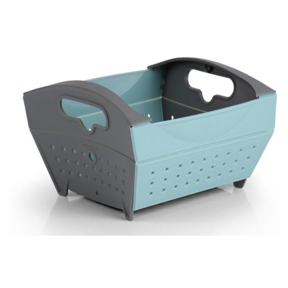 Robustes, faltbares Sieb, multifunktional z.B. für Salat, Obst, Gemüse waschen. Auch als Obst- und Aufbewahrungskorb verwendbar. hochwertig gefertigt mit Feststellknopf zum Schließen robust und langlebig Technische Daten: Maße geöffnet: 24 x 23 x 15 cm Maße gefaltet: 32 x 30 x 2,5 cm Gewicht: 300 g Farbe: aqua/grau
