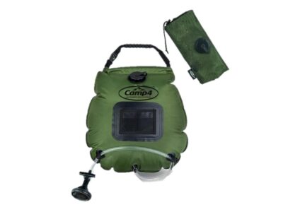 Die Dusche verfügt über einen regulierbaren Absperrhahn am großen Duschkopf und integrierter Temperaturanzeige. Die Sonne erhitzt das Wasser bis auf 40° C. Mit On/Off-Switch Wasserfluss einstellbar Mit Temperaturanzeige Inklusive Tragetasche Mit Aufhängevorrichtung Technische Daten: Volumen: 20 l Material: PVC Gewicht: 0,5 kg Farbe: olivgrün Lieferumfang: 1x Solardusche 1x Packtasche