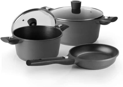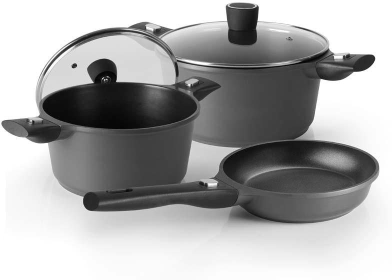 Das hochwertige 5-teilige Alu-Topfset hat eine Antihaft-Beschichtung sowie abnehmbare Griffe. mit Glasdeckel & Silikonknauf Deckel mit Dampf-Ablass-Öffnung abnehmbare Griffe Antihaftbeschichtung Technische Daten: Material: Aluminium Lieferumfang: 1 Topf Ø 20 cm, H 10 cm, 2,8 L 1 Topf Ø 24 cm, H 11,5 cm, 4,5 L 1 Pfanne Ø 24 cm, H 5,5 cm, 2 L Hinweis: nicht für Induktionskochfelder geeignet