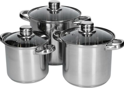 6-teiliges Edelstahl-Topfset mit Glasdeckel. Bestehend aus 3 Töpfen mit Edelstahlgriffen an den Seiten und auf den 3 Deckeln Töpfe mit Glasdeckeln aus hochwertigem Edelstahl mit Edelstahlgriffen Technische Daten: Material: Edelstahl Materialstärke an den Seiten: 0,5 mm Boden: Aluminium 1 mm Gewicht: ca. 2,20 kg Lieferumfang: 1 Topf ø 18 x H 17 cm 1 Topf ø 16 x H 15 cm 1 Topf ø 14 xH 13 cm 3 Glasdeckel