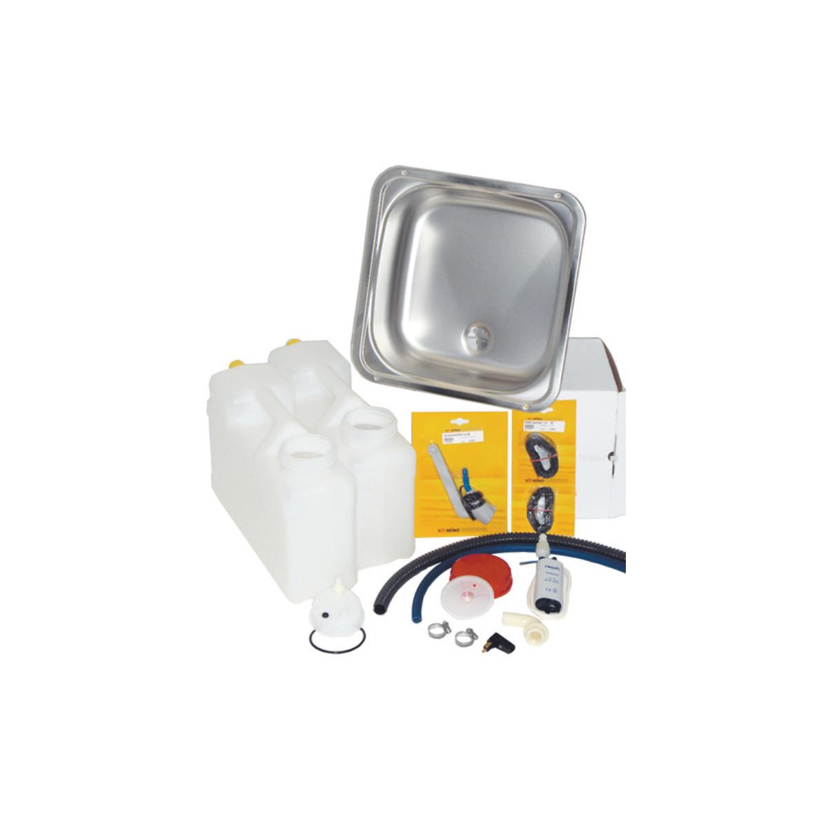 Einbauset für eine Campingspüle mit Kanister – für Frischwasser an jedem Ort Das zusammengestellte Komplett-Set ist für verschiedene Einbausituationen erdacht. Die Spüle wird per 12V Anschluss mit einem Frischwasserkanister, Pumpe und einem Kanister für Abwasser betrieben. Perfekt passend als Kanisterwasseranlage für ausgebaute Campingbusse oder für andere Plätze an denen kein Wasseranschluss greifbar ist. Set besteht aus: 2 x 12 Liter Kanister 12 V Tauchpumpe Wasserhahn Spülbecken 37 x 37 cm Edelstahl…