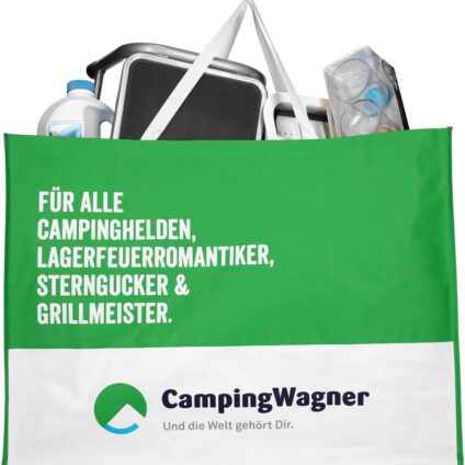 Hochwertige XXL-Tragetasche im Camping Wagner-Design. Vielseitiger Begleiter: geeignet für deinen Urlaub, Einkauf oder zur Aufbewahrung. Mit zwei Henkelpaaren in zwei verschiedenen Längen extrem stabil leicht zu reinigen (einfach mit handwarmen Wasser reinigen) platzsparend zusammenfaltbar Technische Daten: Volumen: 99 Liter Material: 100% Polypropylen Material Henkel: aus Nylon, kreuzvernäht Grundfarbe: weiß Stärke: 140 g/m² Maße (LXBxH): 75 x 25 x 55 cm Maße Henkel: 2,5 x 45 cm und 2,5 x 70 cm