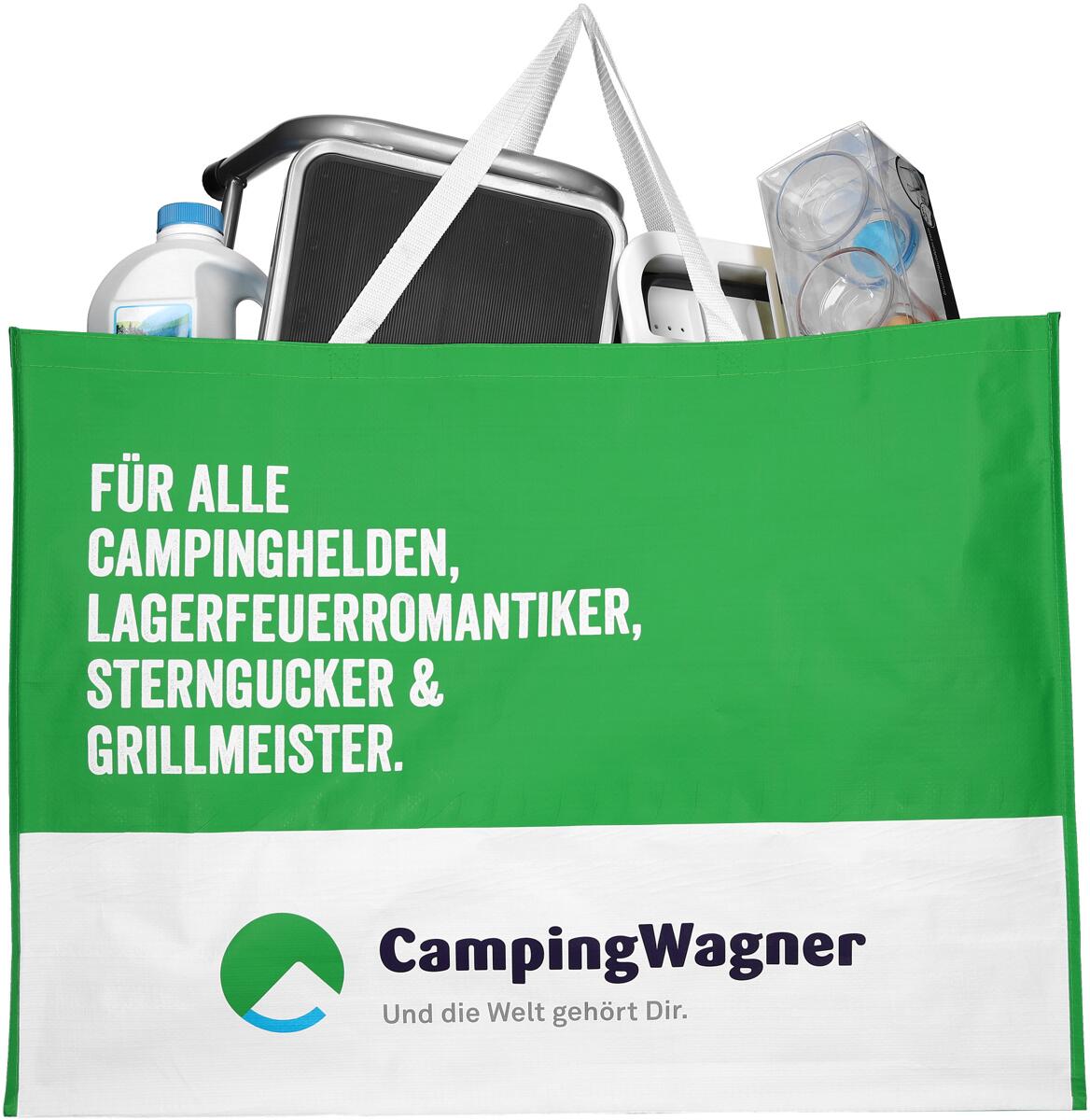 Hochwertige XXL-Tragetasche im Camping Wagner-Design. Vielseitiger Begleiter: geeignet für deinen Urlaub, Einkauf oder zur Aufbewahrung. Mit zwei Henkelpaaren in zwei verschiedenen Längen extrem stabil leicht zu reinigen (einfach mit handwarmen Wasser reinigen) platzsparend zusammenfaltbar Technische Daten: Volumen: 99 Liter Material: 100% Polypropylen Material Henkel: aus Nylon, kreuzvernäht Grundfarbe: weiß Stärke: 140 g/m² Maße (LXBxH): 75 x 25 x 55 cm Maße Henkel: 2,5 x 45 cm und 2,5 x 70 cm