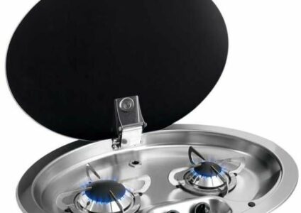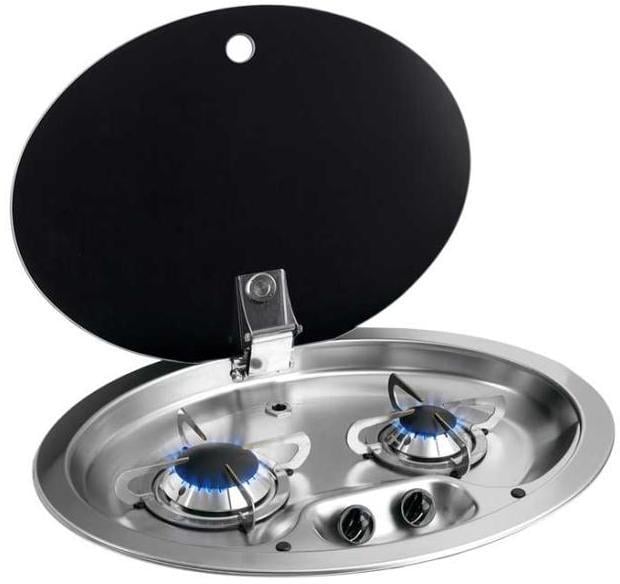 2-flammiger Kocher 30mbar Oval Aus Edelstahl mit schwarzer Glasabdeckung Ideal geeignet für den Einbau in kleinere Reisemobile, Caravans oder Busse Brennerkopf Edelstahl Mit Zündsicherung Brennerleistung: 1 kleiner Brenner: 1000 W -73 g/h 1 mittlerer Brenner: 1750 W -127 g/h Maße: B51 xT39 x H8,5 cm Gewicht: 3,9kg