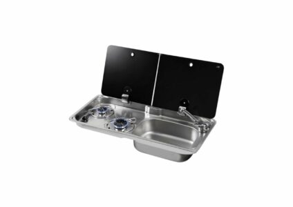 2-flammige Kocher-Spülen-Kombination mit Glasabdeckung und Piezo-Zündung. Spüle rechts 2 teilige Glasabdeckung versenkte Scharniere Piezo-Zündung Spüle rechts Technische Daten: Maße: B765x T355 x H50/100mm Einbauabmessungen: 730 x 320 mm Leistung: 2,9 kW (1 x 1 kW, 1 x 1,9 kW) Gasanschluss: 30mbar Gasverbrauch: 200 g/h (1 x 73 g/h, 1 x 127 g/h) Gewicht: 6 kg Lieferumfang: FL1765 Kocher-Spülen-Kombination (ohne Wasserhahn)