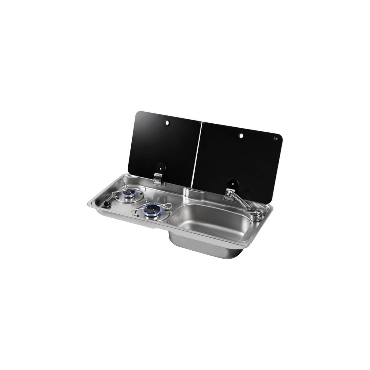 2-flammige Kocher-Spülen-Kombination mit Glasabdeckung und Piezo-Zündung. Spüle rechts 2 teilige Glasabdeckung versenkte Scharniere Piezo-Zündung Spüle rechts Technische Daten: Maße: B765x T355 x H50/100mm Einbauabmessungen: 730 x 320 mm Leistung: 2,9 kW (1 x 1 kW, 1 x 1,9 kW) Gasanschluss: 30mbar Gasverbrauch: 200 g/h (1 x 73 g/h, 1 x 127 g/h) Gewicht: 6 kg Lieferumfang: FL1765 Kocher-Spülen-Kombination (ohne Wasserhahn)