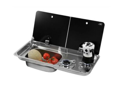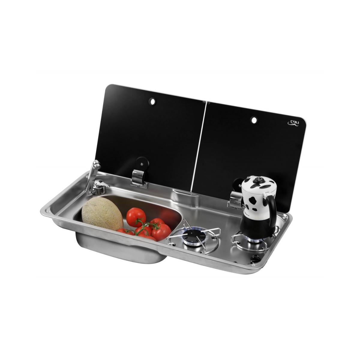 2-flammige Kocher-Spülen-Kombination mit Glasabdeckung und Piezo-Zündung. Spüle links 2 teilige Glasabdeckung versenkte Scharniere Piezo-Zündung Spüle links Technische Daten: Maße: B765x T355 x H50/100mm Einbauabmessungen: 730 x 320 mm Leistung: 2,9 kW (1 x 1 kW, 1 x 1,9 kW) Gasanschluss: 30mbar Gasverbrauch: 200 g/h (1 x 73 g/h, 1 x 127 g/h) Gewicht: 6 kg Lieferumfang: FL1765 Kocher-Spülen-Kombination (ohne Wasserhahn)