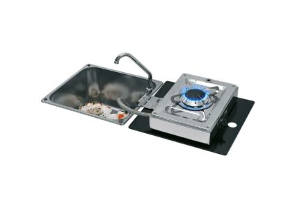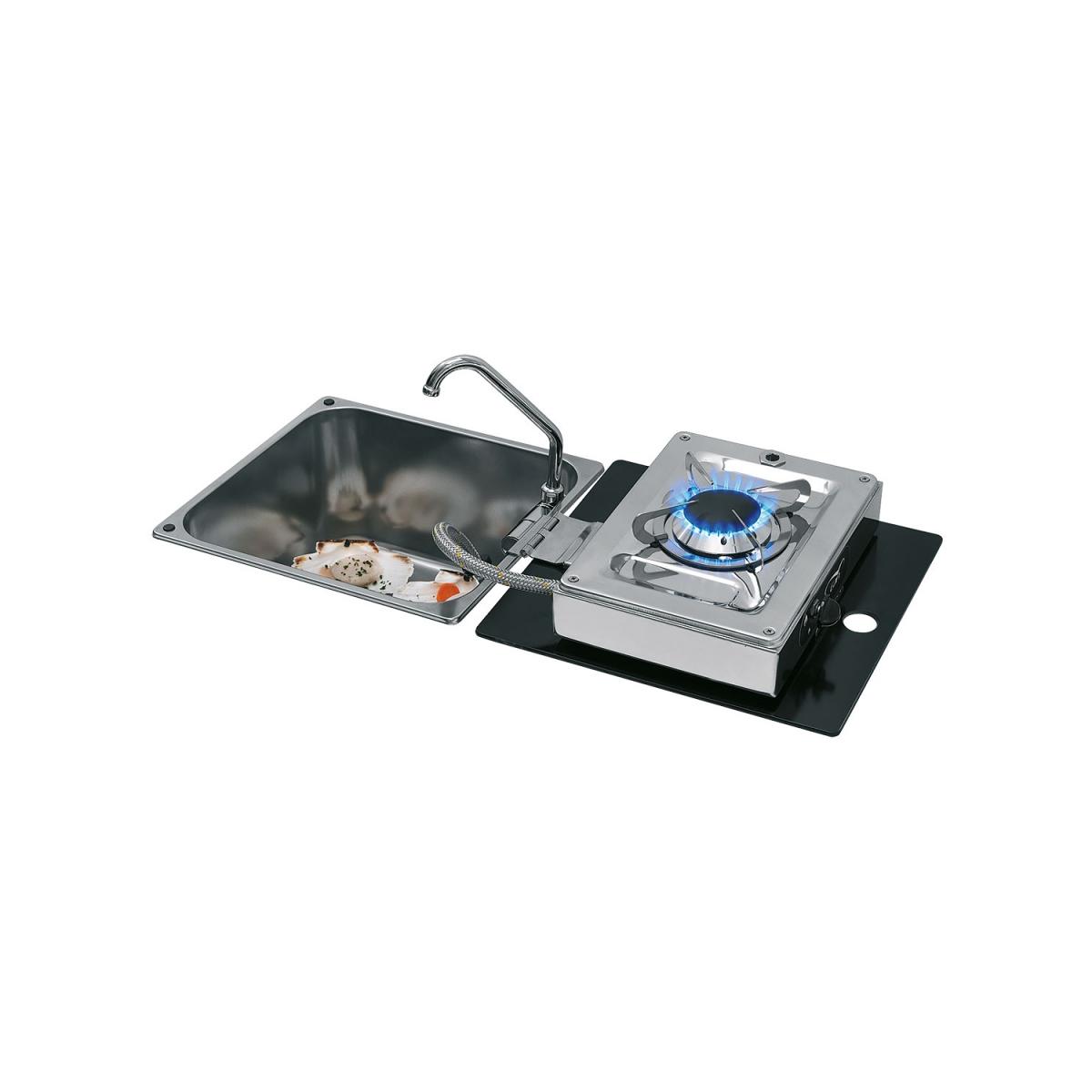 Kocher-Spülen-Kombination aus Edelstahl, bestehend aus einem 1-flamm Kocher mit 30mbar und hitzebeständigem Glasdeckel und einem Waschbecken komplett mit Wasserhahn und einem Gasschlauch inkl. Anschluss. ideal geeignet für Campingbusse, kleine wie große Reisemobile und Caravans mit klappbarem Wasserhahn und hitzebeständigem Glasdeckel mit Zündsicherung eckige Ausführung Technische Daten: Gasdruck: 30 mbar Gasverbrauch: 127 g/h Leistung: 1,9 kW Maße (BxHxT): 350 x 150 x 320 mm Gewicht: ca. 6 kg…