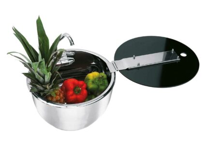 Edelstahl-Waschbecken mit hitzebständiger Glasabdeckung und Wasserhahn Hohe Qualität Hochwertige Verarbeitung Inklusive klappbarem Wasserhahn Ø 30 cm Einbautiefe: 18 cm Gewicht: ca. 3,4kg