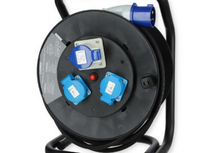 Sicherheits-Kabeltrommel aus bruchfestem Spezialkunststoff. Spritzwassergeschützt Mit CEE-Stecker und -Kupplung. Mit zwei Schuko-Steckdosen und 1 CEE-Steckdose, alle mit Klappdeckeln Eingebauter Thermo-Schutzschalter Technische Daten: Länge: 25m (Sicherheitskabel) HO7 RN-F 3 x 2,5 mm² Maße: ca. 40 x 20 x 20 cm. Gewicht 8 kg