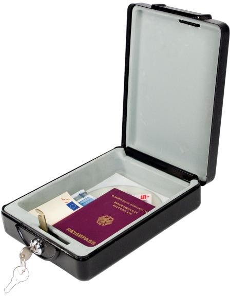 Stabil und handlich. Durch die mitgelieferte, festverschraubbare Halterung ist Safety jederzeit schnell einzuschieben bzw. zu entnehmen. In den abschließbaren Korpus passen Reisepässe, CD',s und vieles mehr. Kassette wird mittels Schlosszunge mit Halter fest verbunden. Safebox, Halter, 2 Schlüssel, 6 Befestigungsschrauben Maße: Halter: ca. B 16 x T 23 x H 7,3 cm: Kassette: ca. B 15 x T 21 x H 5,5 cm Gewicht: 2 kg