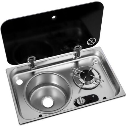 Kocher-Spülen Kombination mit integrierter Spüle auf der linken Seite 1-flammig mit Zündsicherung und Piezo-Zündung Mit Glasabdeckung Ideale Lösung für Campingbusse und Vans Technische Daten: Anzahl Brenner: 1 Leistung: 1.8 kW Gasdruck: 30 mbar Verbrauch Gas g/h: 131 g/h Zündung: Piezo Zündsicherung: Ja Einbaumaß Tiefe: 305 mm Einbaumaß Breite: 508 mm Tiefe: 326 mm Breite: 526 mm Höhe: 163 mm Gewicht: 7 kg Farbe: Schwarz/Silber Material: Edelstahl Position Bedienelemente: Unten Position Spüle: Links…