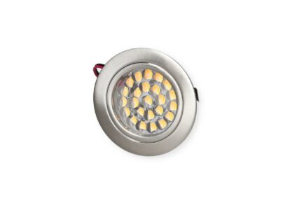 Carbest Edelstahl-LED-Spot mit 24 LEDs Technische Daten: Material: Gebürstetes Edelstahl Spannung: 12V Nennleistung: 1,7W Leuchtmittel: 24 LED',s Lichtstrom: 180 Lumen Leuchtfarbe: Warmweiß Lichtfarbe: 3000K Energieeffizienzklasse: F Gewichteter Energieverbrauch [kWh/1000h]: 2 Maße: ø65 x H11 mm nicht dimmbar