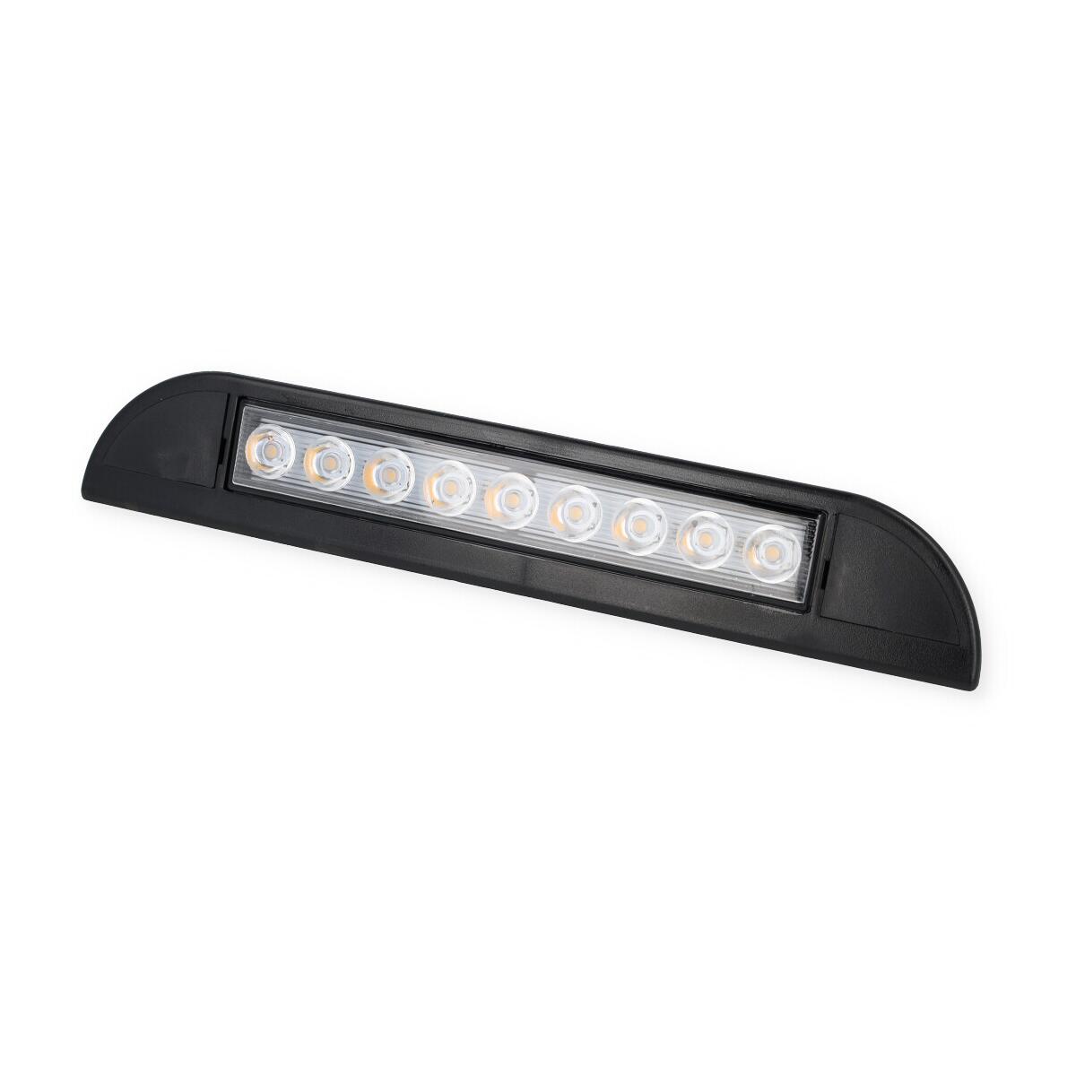 LED-Vorzeltleuchte für Kastenwagen Technische Daten: 12/24V Gewichteter Energieverbrauch [kWh/1000h]: 2 Energieeffizienzklasse: E Farbe: schwarz Abstrahlwinkel: 120 ° Farbwiedergabe: > 80 Länge: 231 mm IP67 3000K 2W 9 SMD LEDs 222 Lumen Gehäuse aus ABS Lieferumfang: LED-Vorzeltleuchte