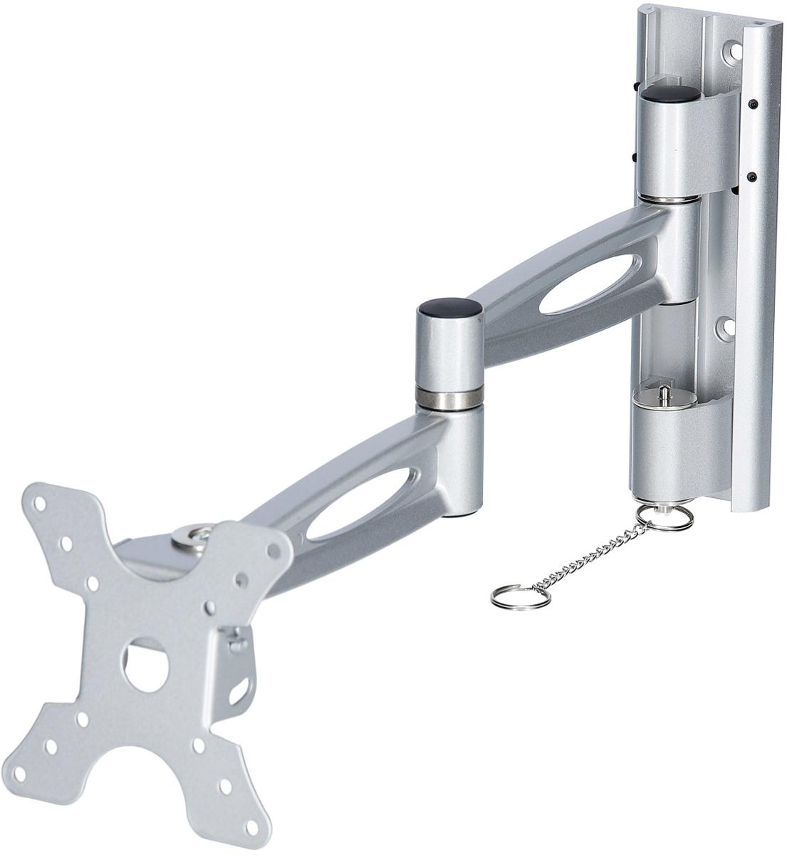 TFT-/TV-Wandhalter mit Arretierungsbolzen Produktmerkmale: Sichere Arretierung während der Fahrt Stabile Ausführung in Aluminium (silber) Passend für LCD-/TFT-Fernseher 15-23 Lochkranz 50×50, 75×75 und 100×100 (Vesa-Standard) Dreh-/und Schwenkbar Technische Merkmale: Armlänge jeweils 175 mm Länge ausgeklappt 430 mm Tragkraft bis 10kg Farbe: Alu/Silber Gewicht ca. 1,0kg