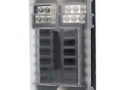 Kompakte Sicherungs- und Verteilerbox für bis zu 12 Stromkreise. Eine rote LED-Leuchte signalisiert sofort, wenn eine Sicherung durchgebrannt ist. Sicherungskasten für Wohnmobil, Boot Für bis zu 12 Stromkreise LED-Ausfallkontrollanzeige Integrierte Minusschiene Inklusive transparenter Kunststoffabdeckung Inklusive Befestigungsschrauben Lieferung ohne Sicherungen! Technische Daten: Anzahl der Stromkreise: max. 12 Belastbarkeit pro Stromkreis: max. 30 A Belastbarkeit gesamt: max. 100 A Spannung: max. 32 V…