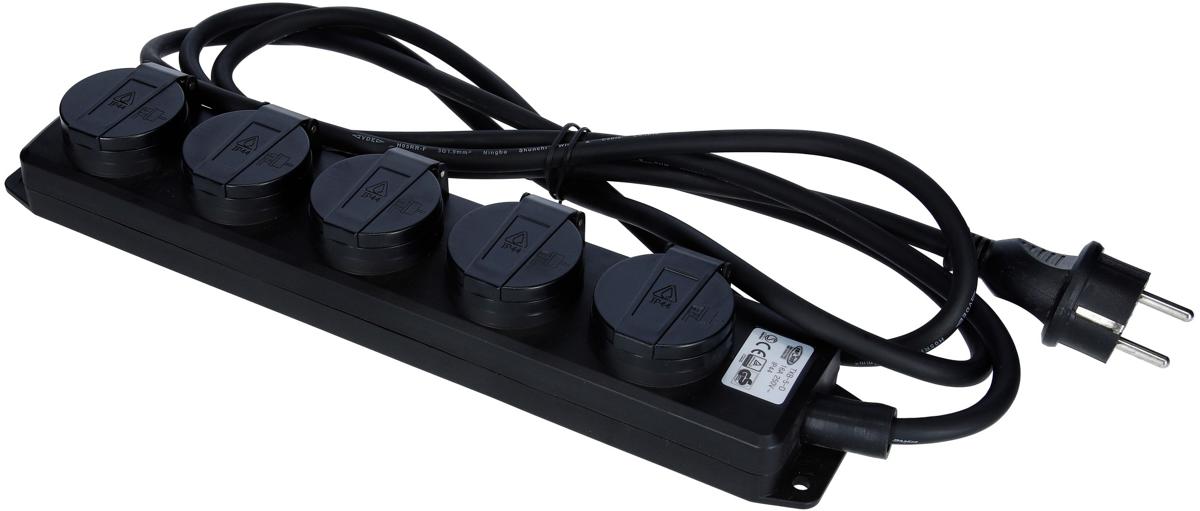 Schuko-Stecker auf Steckdosenleiste mit Sicherheitsklappdeckel. für den Innenbereich Technische Daten: 5-fach H05 RR-F 3×1,5 mm² mit 2,5m Kabel
