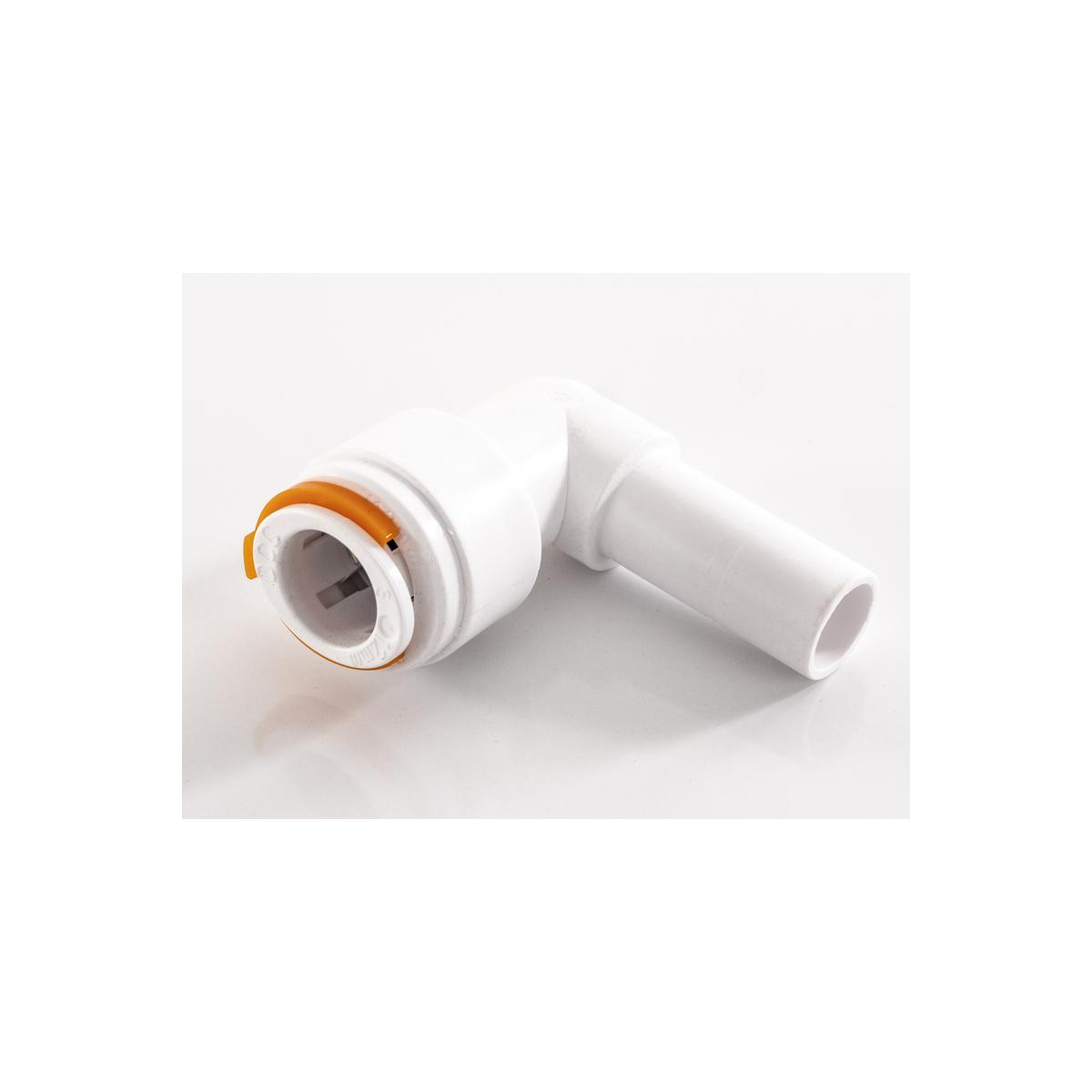 Winkelsteckanschluss 90° für Ø 12 mm Stecksystem auf Ø 12 mm Rohr. Verlegung ohne Kickstellen für optimalen Schutz Stecksystem für eine schnelle Montage Inkl. Sicherungsring 100% dicht bis zu einem Betriebsdruck von 12 Bar (23°C) Lebensmittelecht Kein umständliches Hantieren mit Schlauchschellen Hochwertige Verarbeitung Technische Daten: gewinkelt: 90° Durchmesser: Ø 12 mm Farbe: weiß / orange Lieferumfang: 1x Winkelsteckanschluss