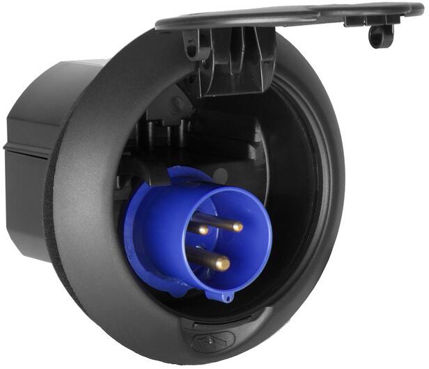 CEE-Eingangssteckdose, 230V, mit Kappdeckel, Ø 143mm, IP44, schwarz matt