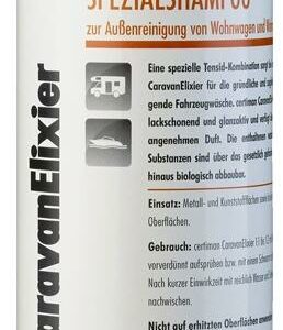 Das CaravanElixier reinigt mit einem angenehmen Duft lackschonend und glanzaktiv. Einfach nur 1:1 bis 1:2 mit Wasser verdünnen, aufsprühen bzw. mit einem Schwamm auftragen. Kurz einwirken lassen und mit genügend Wasser, Schwamm oder Lappen abwaschen. Geeignet für Metall- und Kunststoff-Flächen sowie lackierten Oberflächen. Inhalt: 1000 ml Nicht in der Schweiz zugelassen!