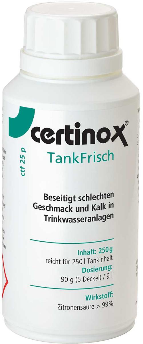 Muffiger Geruch, schlechter Geschmack und Kalk in Wassertanks und Leitungen als Folge langer Stillstandzeiten werden mit Zitronensäure beseitigt. Silberionen schützen vor Wiederverkeimung. Technische Daten: Inhalt 250 g Pulver, reicht für 25 l Spülmenge.