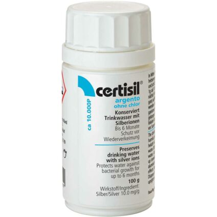 Trinkwasser vom Wasserwerk – in West-, Mittel-, und Nordeuropa – enthält nur wenige Bakterien und keine Krankheitserreger. Deshalb muß es mit certisil argento® nur haltbar gemacht und vor Wiederverkeimung geschützt werden. Mit Silberionen – ohne Chlor – und bis zu 6 Monaten. Technische Daten: Inhalt 100 g Pulver reicht für 10.000 l Wasser